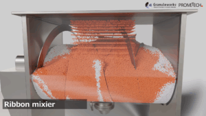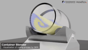 粒子径分布が異なる2種の粒状体を混合するシミュレーション。妥当性検証のために実験と比較した結果、粒子の挙動と混合度が高精度に一致することが確認されています。